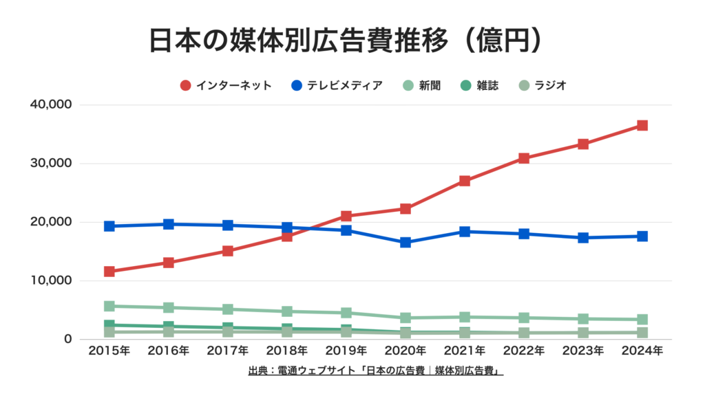 2019年、インターネット広告費がテレビ広告費を超え、その差は拡大し続けています。多くの企業がECサイトで商品を販売し、Google検索面、Yahoo!検索面、YouTube、Instagram、LINEなど、さまざまな媒体に多額の広告費を投じています。